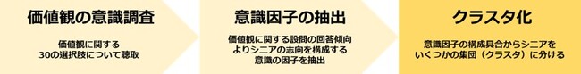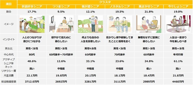 「世話好きシニア」 「つつまシニア」「我が道シニア」「ノスタルシニア」「風まかせシニア」「今でしょシニア」の6つのクラスタが発見されました。