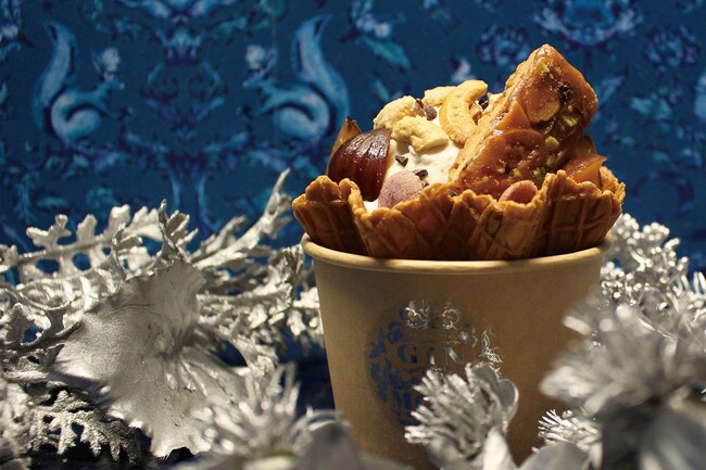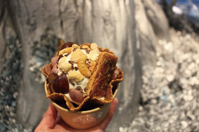 中には、お店で焼き上げた特製のスポンジ生地やキャラメリゼされたナッツ、渋皮栗、お店自慢のクッキーが入って様々な味や食感が楽しめる贅沢な一品。