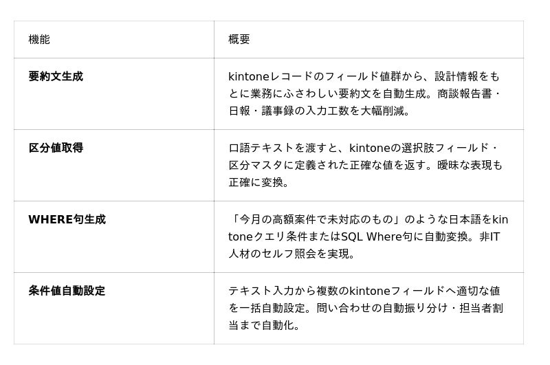 kintoneを業務に活用する企業が増える一方、ChatGPTなどの汎用AIをkintoneと連携させようとしても、AIが各社固有のフィールド名・区分値・業務ルールを知らないため、意図しない値の生成や処理エラーが頻発するという課題が顕在化していました。また、AI連携にはAPIの知識や開発リソースが必要とされており、IT担当者が不在の現場部門では導入のハードルが高いという実態がありました。