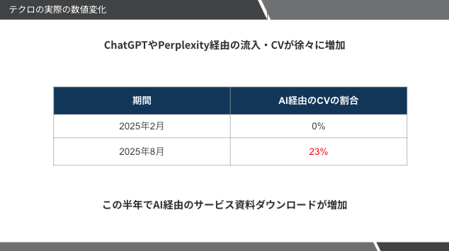 また生成AIの利用者が増えると同時に、AI検索経由の流入・問い合わせが増えているのも事実。実際、テクロは2025年2〜8月の半年間で、生成AI経由の資料ダウンロードが約23%増加しました。