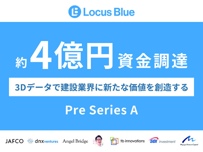 iPhone、レーザースキャナー、ドローンなど各種機器で取得した3D点群データをオンラインで解析が出来るプラットフォーム「ScanX(スキャン・エックス)」を提供するローカスブルー株式会社(本社:東京都渋谷区、代表取締役:宮谷 聡)は、ジャフコ グループ、DNX Ventures、Angel Bridge、エンジェル投資家の有安伸宏、tb innovations、SBIインベストメント、宮銀ベンチャーキャピタルの各社が運営もしくは関与するファンドを引受先とした第三者割当増資ならびに、日本政策金融公庫からの融資により総額約4億円の資金調達を実施したことをお知らせします。今回の資金調達で、ScanXの利用顧客拡大のための営業体制強化およびCTOやVPoE採用をはじめとした開発組織強化を進めて参ります。また、新サービスとして、3Dデータ専用AIエンジン”Deep3(ディープスリー)”の計画を発表したことも合わせてお知らせします。