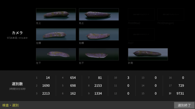 さつまいもの傷、カビ、虫食い等の外観不良検出、大きさや形状等も加味した等階級選別の自動化ラインを実現。
