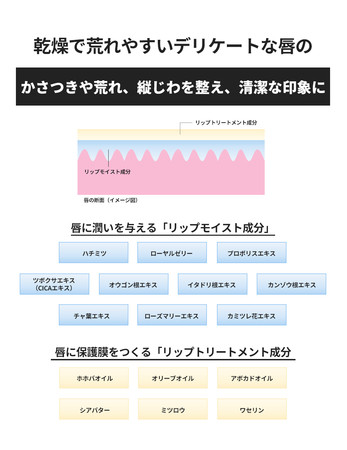 唇に潤いを与える「リップモイスト成分(※1)」と、唇に保護膜をつくる「リップトリートメント成分(※2)」を配合。