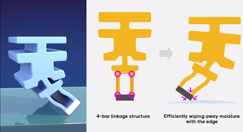 滑らかな拭き取り動作のために、4段連結構造を採用し、ワイパー振動時に接地面が最大になるよう設計されています。これにより、素早い拭き取りが可能となり、ワイパーゴムの角によって静かで効率的に水滴を除去することが出来ます。