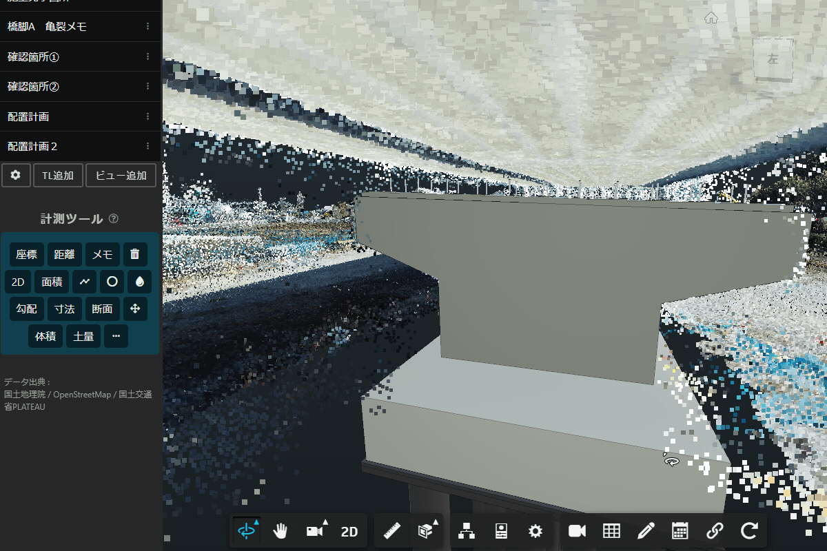 水平断面で3Dモデルを分割すれば、計測したい部分だけを体積計算できます。例えば、コンクリートを打設する高さに断面を追加すれば、その部分までのコンクリート数量を算出できます。断面スライスした体積も計算可能です。