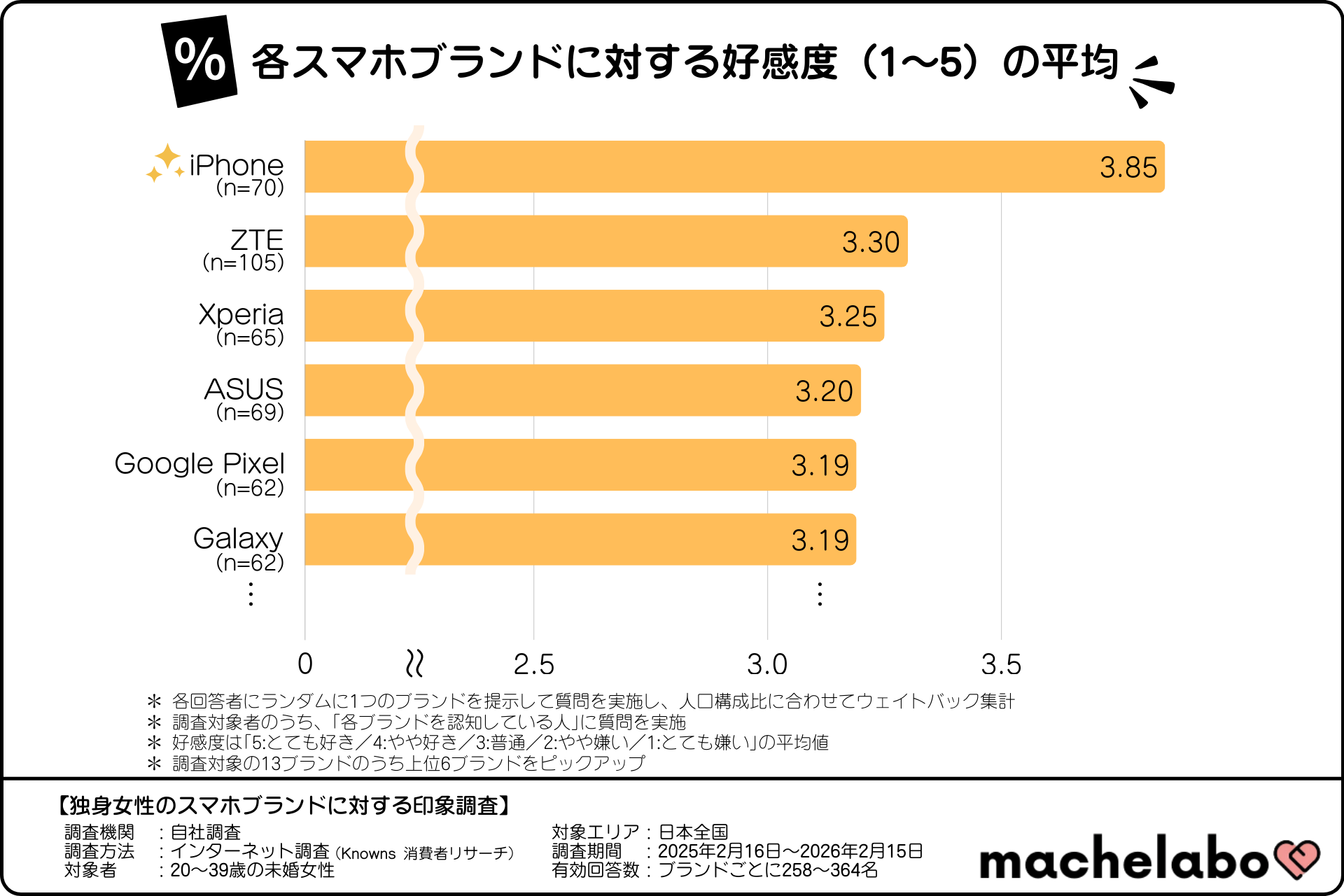 上位5ブランドの結果を見ると、『iPhone』が3.85となりました。次いで『ZTE』が3.30、『Xperia』が3.25、『ASUS』が3.20、『Google Pixel』および『Galaxy』が同率の3.19と続きます。