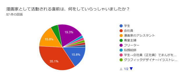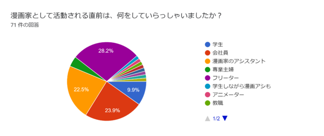 「漫画家として活動される直前は、何をしていらっしゃいましたか?」という質問に対し、商業漫画家では「フリーター」が約28%と最も多く、広告漫画家では「会社員」が約35%と最も多い結果となりました。ビジネス経験のある人が、その知見を活かして広告漫画家となることが多いようです。