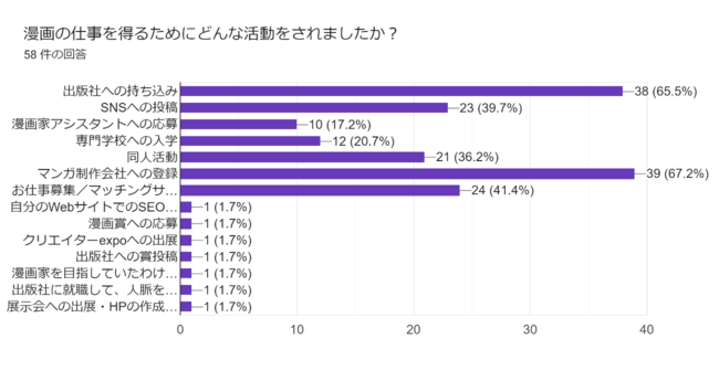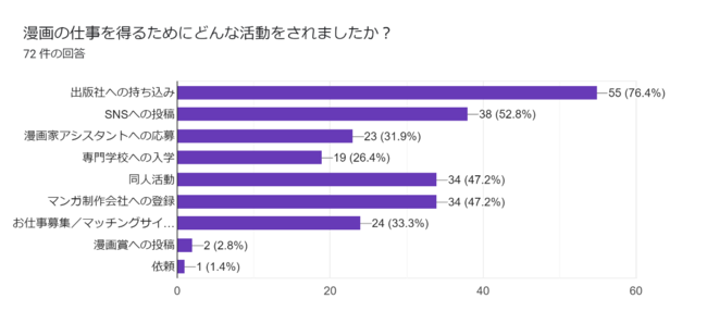 マンガの仕事を得るためにした活動は多岐にわたりますが、商業漫画家では半数以上を「SNSへの投稿」が占めていることが、近年の特徴と言えます。