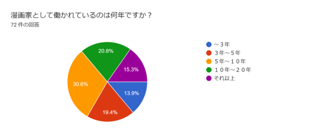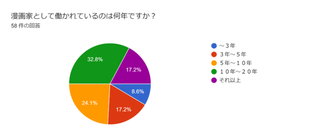 「漫画家として働かれているのは何年ですか?」という質問に対して、10年以上と回答したのは、商業漫画家で約35%、広告漫画家で約50%という結果となりました。広告漫画家の方が、キャリアが長い人が多いということが分かります。広告漫画家の中には、かつて商業漫画家として活動していたが、広告漫画家に転向したという人も含まれます。