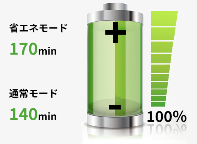 前世代の「S3」に比べて、「C1000」には7800mAh超大容量バッテリーが内蔵されます。省エネモードでは約170min、通常モードでは約140min稼働可能です。実際の「ワイヤレス」を実現し利便性が大幅にアップした「C1000」があれば、いつでもどこでも投影を堪能できます。