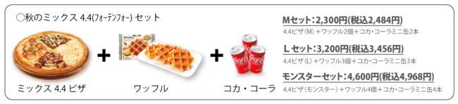4種のピザが1枚で楽しめるお得な「ミックス4.4(フォーテンフォー)セット」が秋バージョンにリニューアル!定番4種の「ベストミックス4.4」他2品に加え、贅沢4種の「プレミアムミックス4.4」が新登場。ベルギー産発酵バターを使用した(※)「マネケンプレーンワッフル」とドリンクがどの4.4ピザにももれなくついてくるお得なセットです。お手頃Mサイズから日本最大級!?直径45cmモンスターサイズまでシーンに合わせて幅広くご利用いただけます。