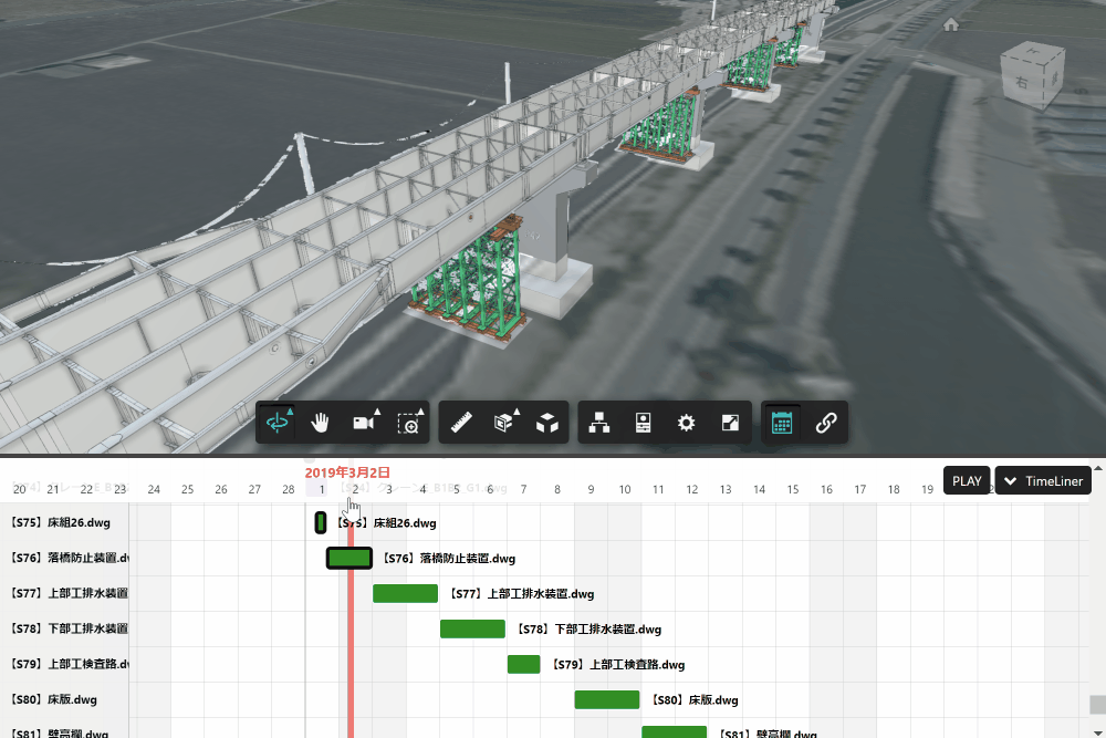 BIM/CIMモデルと工程表を連携し、クラウド上で4D施工シミュレーションを共有・編集できる4D工程管理クラウドです。Autodesk Navisworks(R) のタイムライナー設定から自動生成でき、進捗管理や遅延箇所の抽出などにも対応しています。