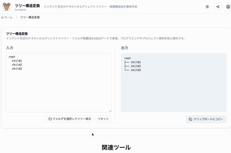 『ツリー構造変換 by Toolpods』は、簡単なインデント形式(スペースやタブで深さを表したテキスト)を入力するだけで、自動で見やすい階層図を作ってくれる便利なツールです。