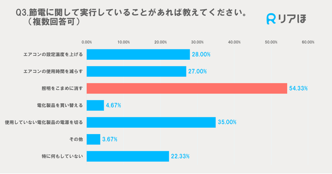 節電に関して実行していることに関しては、「照明をこまめに消す」が最も多く54.33%、次いで「使用していない電化製品の電源を切る」が35%、「エアコンの設定温度を上げる」が28%の順となりました。