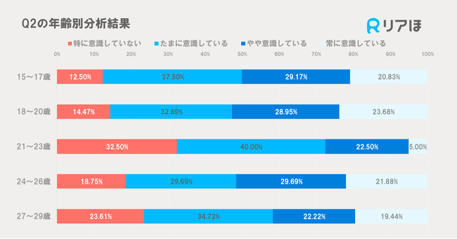 Q2の回答を年齢別に集計したところ、「特に意識していない」の割合が最も多かったのが21歳〜23歳男女の32.5%となり、「常に意識している」と回答した方は5%と、最も低い結果となりました。
