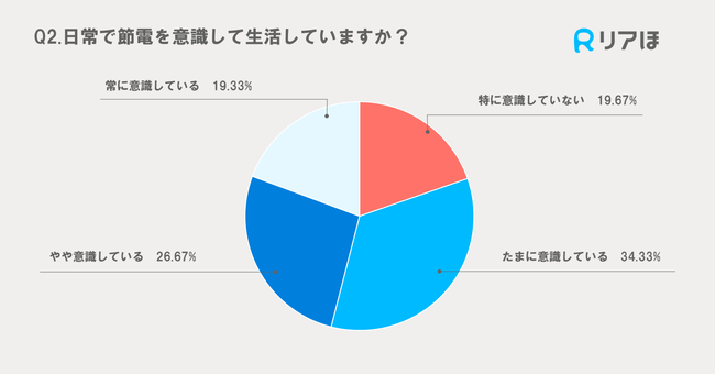 日常で節電を意識しているかの質問に対しては、「たまに意識している」が最も多く34.33%、次いで「やや意識している」が26.67%となりました。