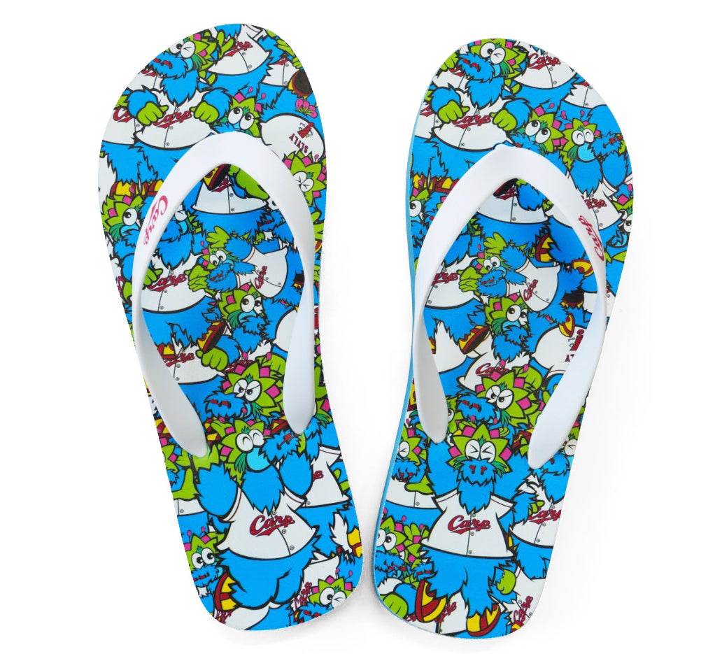 ■ビーチサンダルバージョンスラィリー変幻自在な動きでスタジアムを沸かせるスラィリーの魅力を、ぎゅっと凝縮してビーチサンダルに落とし込みました。全面を埋め尽くすスラィリーたちが圧倒的な存在感を放ちます。ストラップはホワイトで、カープロゴがワンポイントで入っています。