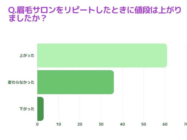 眉毛サロンをリピートしたときの値段をお聞きしたところ「上がった(69%)」、「変わらなかった(29%)」、「下がった(2%)」という結果になりました。