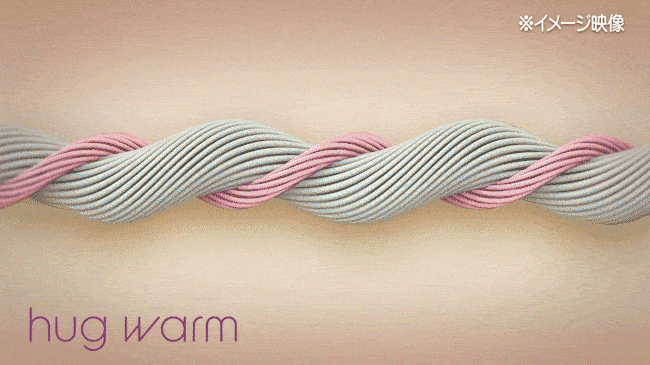 ぎゅっとハグをすると「幸せホルモン(オキシトシン)」が分泌され、副交感神経が優位になり、リラックスできるといわれています。「hug warm」はこのリラックス効果に着目。赤ちゃんの抱っこや大切な人とのハグ、お気に入りのぬいぐるみを抱きしめたときに感じる心地よさを、特殊構造の糸と特許技術を使って再現しました。
