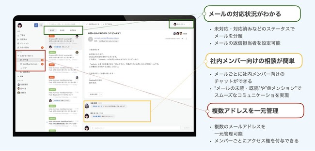 yaritoriは、複数人でのメール対応・管理を効率化するクラウド型のメール共有システムです。「support@」「sales@」などの共有アドレスに届くメールの対応状況を可視化し、メールごとに社内メンバーと相談しながら返信することができます。