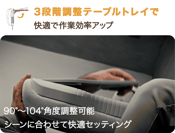 PC作業や映画鑑賞、軽食などに便利な3段階調整のテーブルトレイを搭載。さらに、2つのドリンクを同時に置けるデュアルカップホルダーを内蔵し、長時間の作業やくつろぎの時間をサポートします。必要なものを手元にまとめて配置できるため、仕事や趣味に集中しやすい環境を実現します。