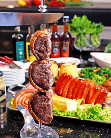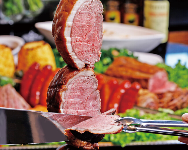 シュラスコとは、大串に刺した塊肉や果物を専用マシーンで回転させながら、外はカリっと中はジューシーにグリルするブラジル発祥の肉料理です。焼き立ての食材を大串に刺さったままでテーブルに運び、お客様の目の前でダイナミックに切り分けてご提供いたします。
