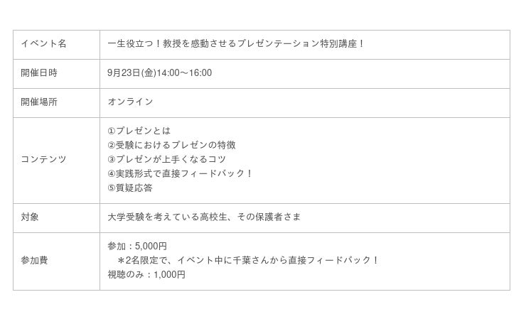 当日参加する受験生の中から「2名限定」で千葉さんのフィードバックを直接受けられる。