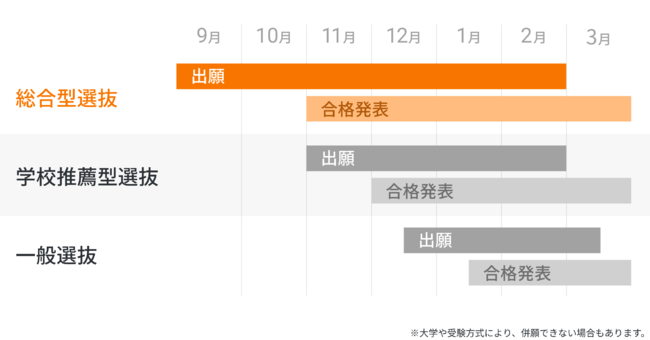 総合型選抜(AO入試)では、多くの大学で9月から出願(エントリー)が始まる。他の受験よりも開始時期が早く、9月〜12月にかけてが受験勉強のピークとなる。