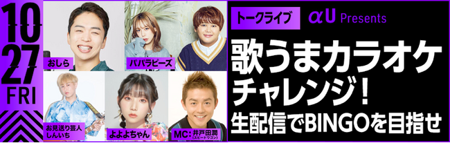 スピードワゴン・井戸田潤、令和の歌まねヒロイン・よよよちゃん、カリスマボイストレーナーとしてYouTubeで活躍するしらスタ【歌唱力向上委員会】のおしら、チャンネル登録者数180万人超え2人組YouTuber・パパラピーズ、R-1グランプリ2022王者のお見送り芸人・しんいちが登場。「αU metaverse」に新しく搭載されたカラオケ機能を体験しながら視聴者参加型のプレゼント企画も実施!生配信中にカラオケで目標点数を達成しBINGOを目指せ!