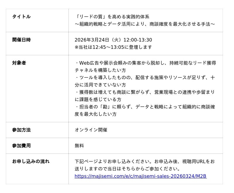 BtoB企業のリード獲得や商談化を支援するテクロ株式会社(所在地:東京都渋谷区、代表取締役:天野 央登、以下当社)が、3/24(火)に開催予定であるマジセミ株式会社(本社:東京都港区、代表取締役社長:寺田 雄一)が主催するウェビナー「「リードの質」を高める実践的体系〜組織的戦略とデータ活用により、商談確度を最大化させる手法〜」に登壇いたします。