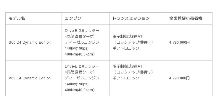 ボルボ・カー・ジャパン株式会社(代表取締役社長:木村隆之、本社;東京都港区)は、ボルボS60/V60の特別仕様車「S60 D4 Dynamic Edition/V60 D4 Dynamic Edition(ダイナミックエディション)」を8月10日より販売を開始いたします。