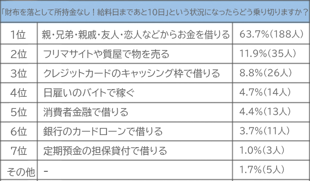 ▼【ランキング】「財布を落として所持金なし!給料日まであと10日」という状況になったらどう乗り切りますか?
