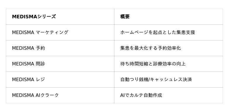 当社は2025年11月にクリニックDXブランド「MEDISMA(メディスマ)」シリーズをリリースし、集患・マーケティングから電話受付、WEB予約、WEB問診・自動カルテ作成、会計決済までを一気通貫で支援する体制を強化してまいりました。今後は、ホームページ制作を起点にMEDISMAシリーズとのシームレスな連携をさらに推し進め、クリニック経営のあらゆるフェーズをワンストップで支援できる医療DXプラットフォームへと発展させてまいります。[表: https://prtimes.jp/data/corp/62237/table/29_1_33d897bbbe820c4ab3a3d54e5ada0587.jpg?v=202604220515 ]