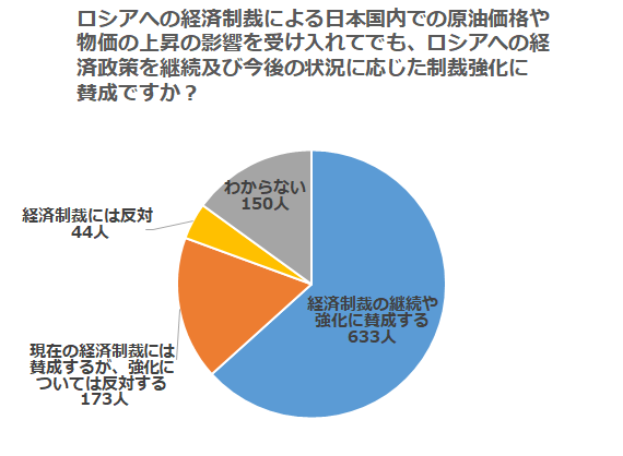 •日本政府が日本国民の義勇兵参加を「認めても良い」と回答した割合は25.9%であったのに対し、「認めるべきでない」と回答した割合は43.5%であった。また、日本がウクライナに対して「武器も含めて提供すべきだと思う」と回答した割合は21.9%にとどまった。そして、63.3%がロシアへの経済制裁による日本国内での原油価格やロシアから輸入している農水産物などをはじめとした物価上昇の影響を受け入れてでも、日本のロシアに対する「経済制裁の継続や強化に賛成する」と回答しており、制裁の維持、強化を望む声が強いことが分かった。義勇兵としての参加や武器の供与といった武力面での対応ではなく、経済制裁による対応を支持する割合が高いことは、戦闘への直接介入ではない形での対応が適切だと考える人が多いことを示していると考えられる。