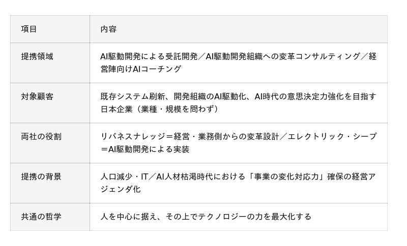 株式会社リバネスナレッジ(本社:東京都新宿区、代表取締役社長:吉田 丈治、以下「リバネスナレッジ」)と、株式会社エレクトリック・シープ(本社:東京都港区、代表取締役:紀平 拓男、以下「エレクトリック・シープ」)は、AIによる業務改革と開発組織変革を目指す企業に対し、AI駆動開発による受託開発、AI駆動開発組織への変革コンサルティング、および経営陣向けAIコーチングを共同で提供するため、業務提携したことをお知らせいたします。