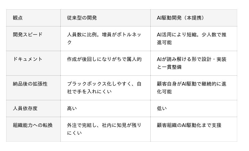 本提携が提供するAI駆動開発アプローチは、従来型の開発と以下のように異なります。