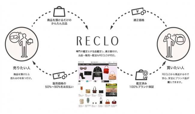 RECLOとは、高級ブランドアイテムを対象とし、ブランド品を売りたい人と買いたい人それぞれのクローゼットを“シェア”しあうリセールプラットフォームです。ユーザーは不要になったブランドアイテムをRECLOに預けるだけ。あとはRECLOが、専属の鑑定士による商品の査定・値付けから出品、取引成立後の入金確認、配送まで全て面倒な作業を行います。加えて、全品正規品保証をお約束する安心・安全な委託&買取サービスを展開することで上質なリセール体験を提供しています。さらに、アジア、欧米、その他さまざまな地域において約200ヶ国で同時併売できるシステムを保有しているため、リセール品を適切な価格でグローバルに販売可能です。