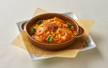 チーズのコクとたまごのまろやかな味わいが良く合い、ビスクソースのオマール海老や香味野菜などの香りと旨味がおいしさを引き立てます。