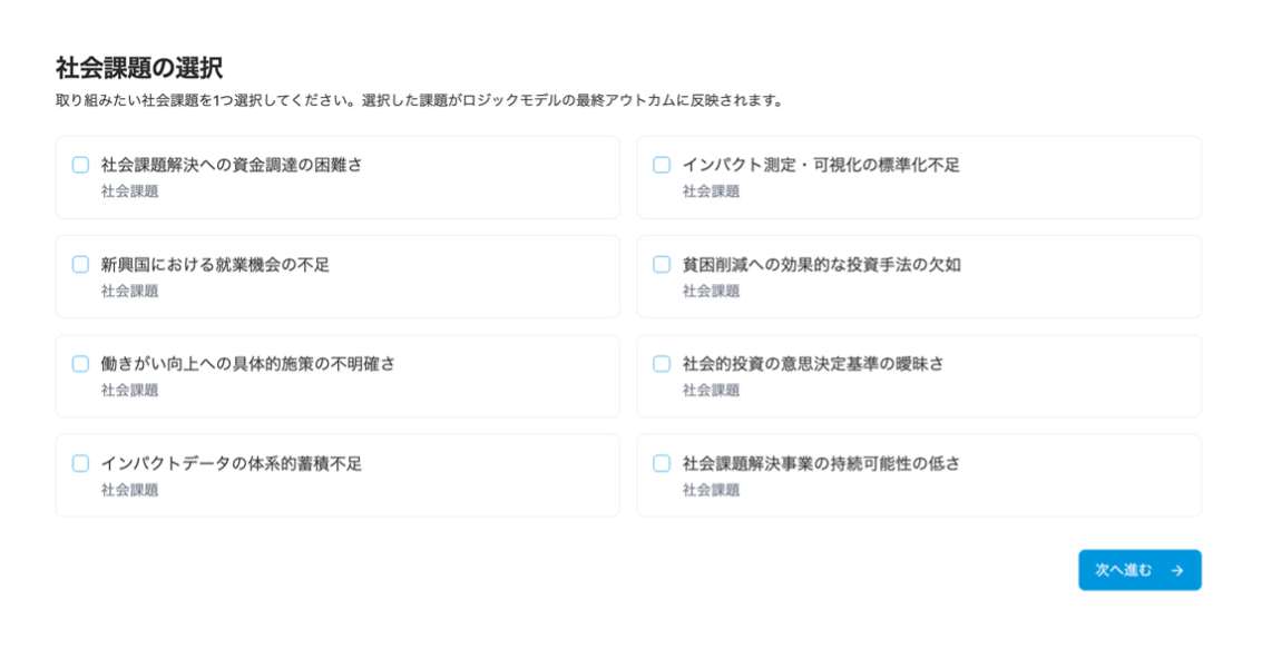 最終アウトカムに最も近い社会課題を特定します。SaaSが生成した複数の社会課題候補のなかから選択可能です