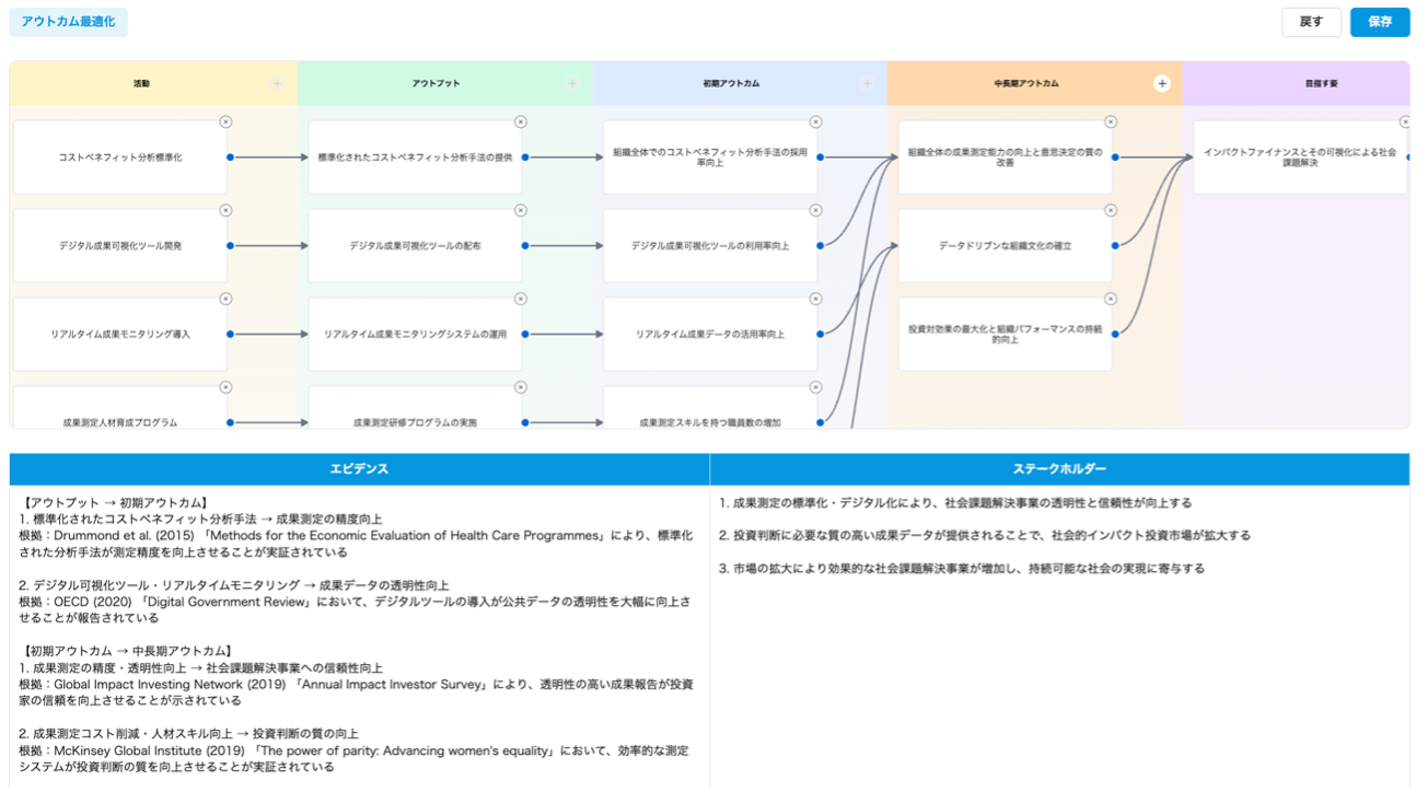 ロジックモデルが自動生成されます。また本画面上で直接、ロジックモデルの編集ができ、最も適切な 形で保存が可能です。 また、ロジックモデル生成におけるアウトカム間等の関係について、参照したオープンデータを表示するよう機能強化しております。