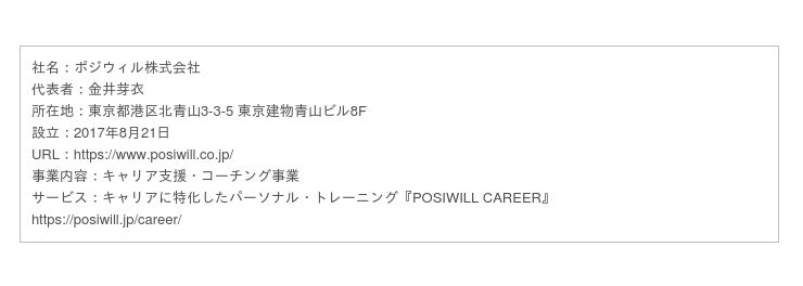 キャリアに特化したパーソナル・トレーニング『POSIWILL CAREER』を運営。自社内の「キャリアトレーナー」による人生の「理想」の可視化、軸の言語化、オンラインでの面談サポート、チャットサポートを通して、だれもが自分らしいキャリアを歩むための支援事業を展開しています。世間一般における理想的なキャリアではなく、それぞれが自分なりのベストなキャリアを歩める社会を実現していきます。