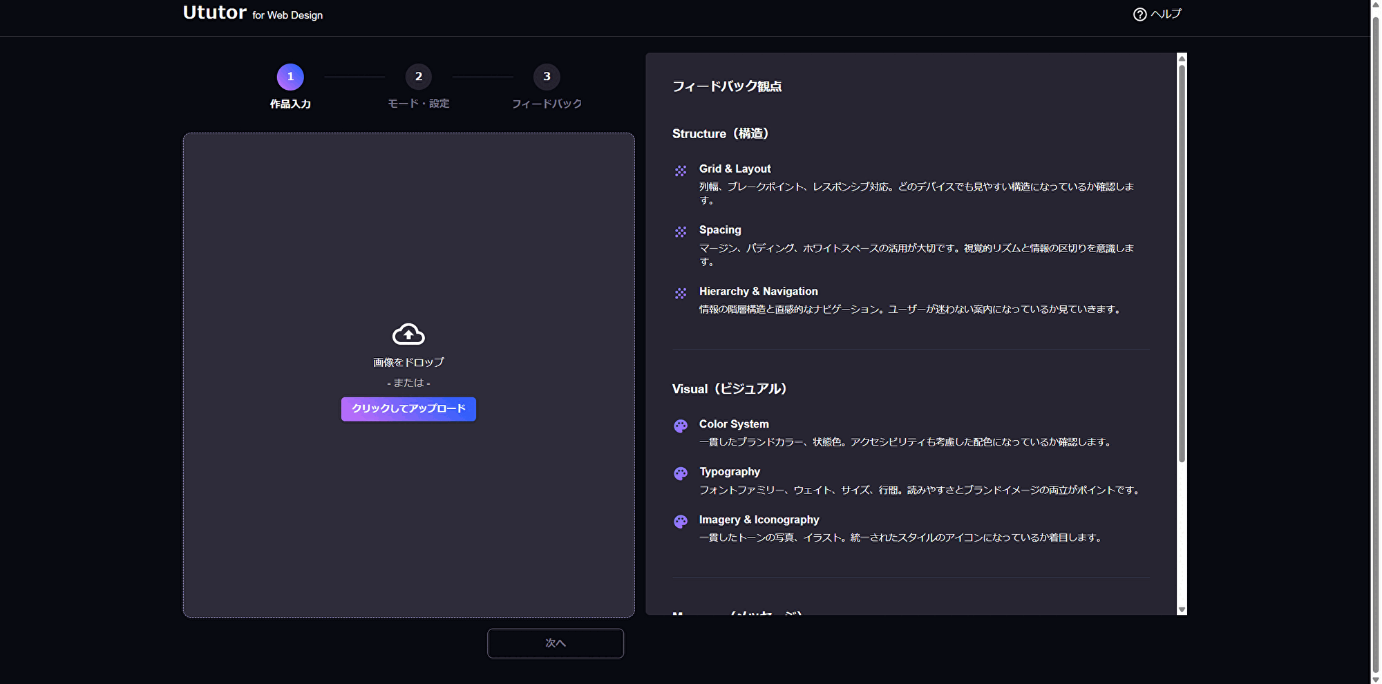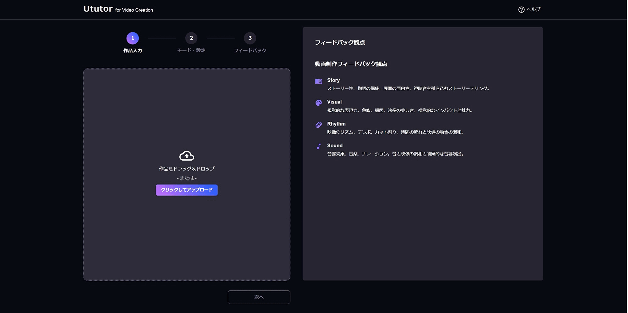 このように、一般的な生成AIが提示する抽象的な表現は異なり、『Ututor』は分野ごとに整理された観点と、教育現場に基づいた具体的な改善提案、学習がしやすいUIで次の制作ステップを迷うことなく進めることができます。