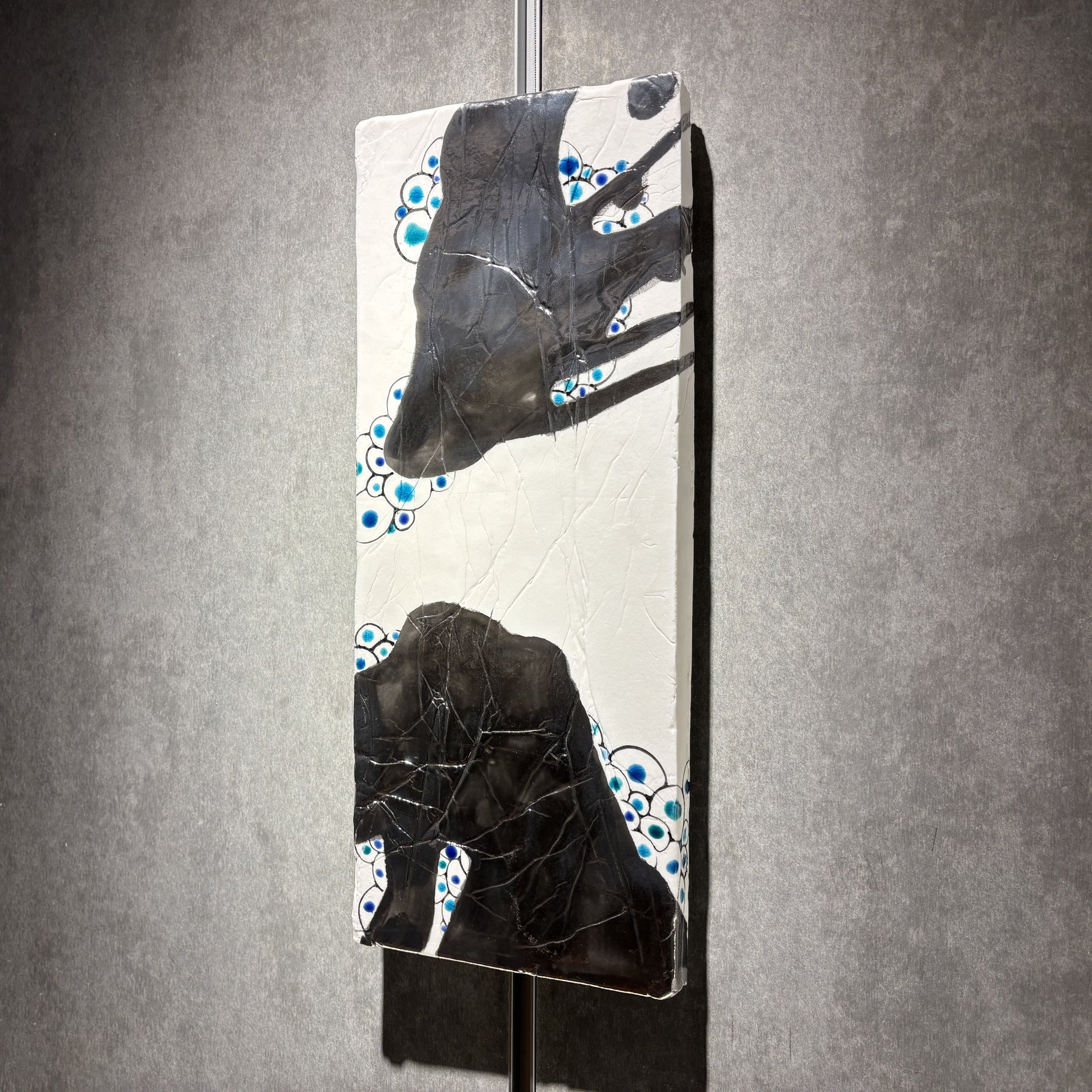 陶芸において、それらを直接的な図像として再現するのではなく、土・釉・火といった物理的条件が相互に作用するプロセスそのものに制作を委ねている。本展では、壁面(壁掛け)という形式を用いることで、器や彫刻といった機能的・量塊的な陶芸の枠組みから一度距離を取り、陶という素材が持つ「表層」「断面」「痕跡」に焦点を当てる。