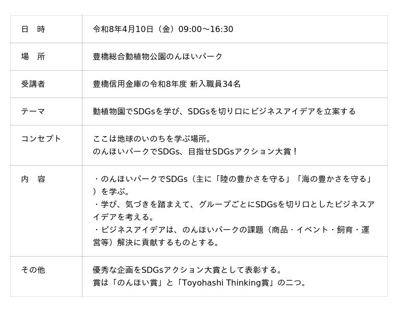 豊橋信用金庫(本店所在地:愛知県豊橋市、理事長:山口 進)は、豊橋総合動植物公園「のんほいパーク」(以下「のんほいパーク」という。)と協業し、動植物園でSDGsを学び、SDGsを切り口にビジネスアイデアを立案する社会人向け教育プログラム「地域共創フィールドワーク」を共同企画。新入職員研修のプログラムのひとつとして、令和8年4月10日(金)に実施し、令和8年度の新入職員34名が参加しました。