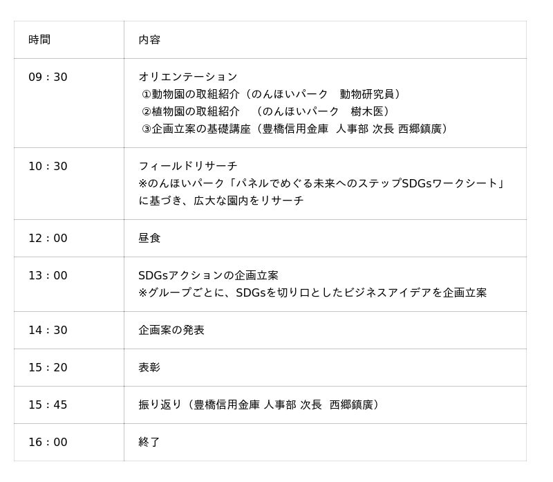 こうした両者の想いが一致し、「地域共創フィールドワーク」の共同企画に至りました。「地域共創フィールドワーク」は、これから様々なビジネスや地域課題にふれる豊橋信用金庫の新入職員が「のんほいパーク」の持続可能な社会の実現に向けた取り組みをヒントにビジネスアイデアを立案。「のんほいパーク」の社会人向け教育プログラムとして「オトナが地球のいのちを学ぶ場所」として新しい価値提供につながります。豊橋信用金庫としても、新入職員がSDGsを身近に感じ意識することで、社会・地域の課題に気づき、高い視座・広い視野から物事を捉えて解決する力を育むこと、そして、「のんほいパーク」との共創を通じ、地域に根差す信用金庫としての使命を体系的に理解することが期待できます。