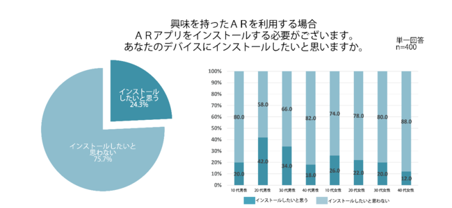 ARを体験する際に、専用のアプリをダウンロードしなければならない場合「インストールしたいと思わない」が75.8%、「インストールしたいと思う」が24.3%でした。ARコンテンツを体験してもらう際の心理的障壁がアプリのダウンロードである事が伺えます。