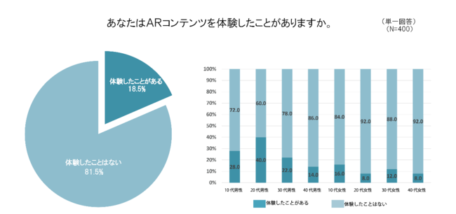 イラストやデジタルコンテンツの企画・制作を行う株式会社アクアスター (所在地:東京都中央区、代表取締役社長:原田 弘良、以下 当社)は、全国の男女400人を対象にARコンテンツを関する調査アンケートを実施しました。アンケートでは、約81.5%の人が「ARコンテンツを体験したことがない」と回答し、「体験したことがある」と回答した人は、18.5%となりました。