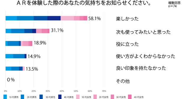 さらにARを体験したことがある方を対象にARを体験した際、どのような気持ちになったかを質問したところ、58.1%が「楽しかった」ついで、31.1%が「次も使ってみたいと思った」18.9%が「役立った」と回答しました。