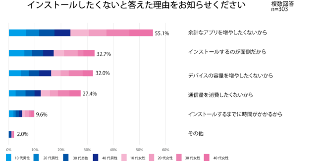 さらに「インストールしたいと思わない」と答えた方にその理由を聞いたところ、55.1%が「余計なアプリを増やしたくないから」、次いで32.7%が「インストールするのが面倒だから」32.0%が「デバイスの容量を増やしたくないから」と回答しました。アプリをダウンロードする手間やデバイスの容量がARコンテンツ普及の高い壁になっている可能性があり、ストレスを感じさせずに楽しんで体験させられる設計づくりがポイントだということが分かります。