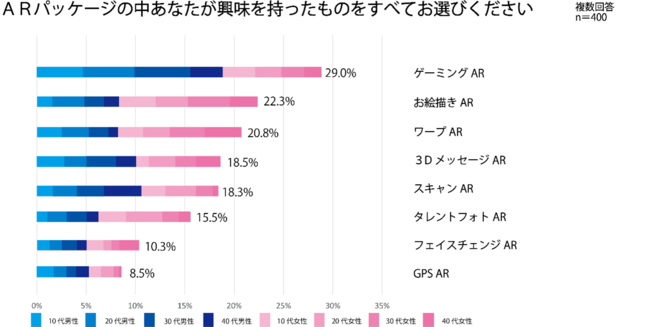 結果は、1番多かった回答が「ゲーミングAR」の29.0%、2番目に「お絵描きAR」の22.3%、3番目に「ワープAR」で20.8%となりました。逆に割合が低かったコンテンツは、「GPS AR」「フェイスチェンジAR」「タレントフォトAR」で自分の顔が映ってしまうものや位置情報など個人に関係する情報を使用するコンテンツが選ばれにくい傾向が見られました。しかし、年齢や性別ごとに数値を見たところ、男性の10代は「GPS AR」が1番人気で、女性の10〜20代では「タレントフォトAR」の割合が多い結果が出ています。